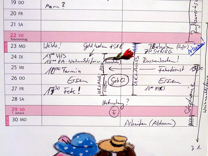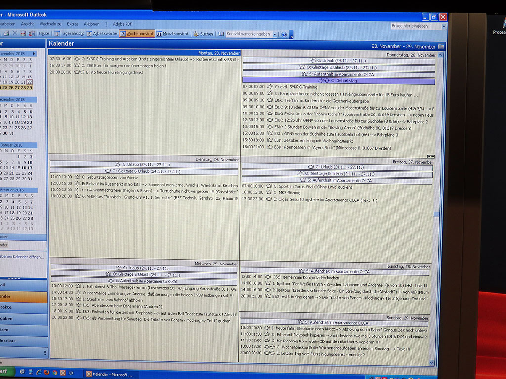 23.11.2015 | Für Olga und Carsten beginnt eine mit Terminen vollgestopfte Woche, denn ein Arbeitstag (heute), vier Urlaubstage, Olgas Geburtstag, die dazugehörige Feier mit Freunden, ein viertägiger Aufenthalt von Stephanie im Apartamento OLCA und ein ganztägiges Familientreffen zu viert anläßlich des Geburtstages benötigen gut koordinierte Vorbereitung, Planung und viel Zeit - zum Glück werden es alles sehr schöne Stunden ! Dagegen sieht der heutige Montag mit Arbeitsalltag, einer Wohnungsführung durch Stephanies neues Domizil via Skype und dem Zusammenlegen von Wäsche samt dem Gucken der DDR-Serie "Archiv des Todes" im Papierkalender und im elektronischen Pendant noch relativ harmlos aus. |