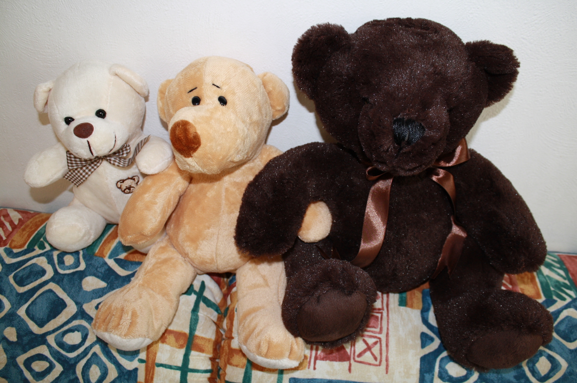 Zum einen kam der Arbeitskollege, dessen Vertretung ich übernommen habe, 2 Tage eher in die Firma zurück als geplant. Dann saß plötzlich ein Bär auf meiner Tatstatur. Die Frau des Kollegen hat ihn eigenhändig ausgestopft. Er heißt Mario und hat eine etwas schiefe Nase, dafür aber einen derart süßen Blick, dass sogar mein Mann dem nicht lange standhalten konnte. Eigentlich habe ich inzwischen keine Bärenzuzugsgenehmigung mehr von ihm, aber Mario darf jetzt mit Ying und Yang auf der Couch sitzen und quatschen. Immerhin haben die drei Teddys ein gemeinsames Thema, denn ich habe sie alle nach und nach in meinem Büro gefunden. Zwei weitere Bürozuzügler haben andere Positionen in meinem Haus bezogen, aber diese drei haben nun die Couch für sich allein. Wenigstens so lange, bis auch wir den Anspruch auf den entsprechenden Sitzplatz erheben.    😉
