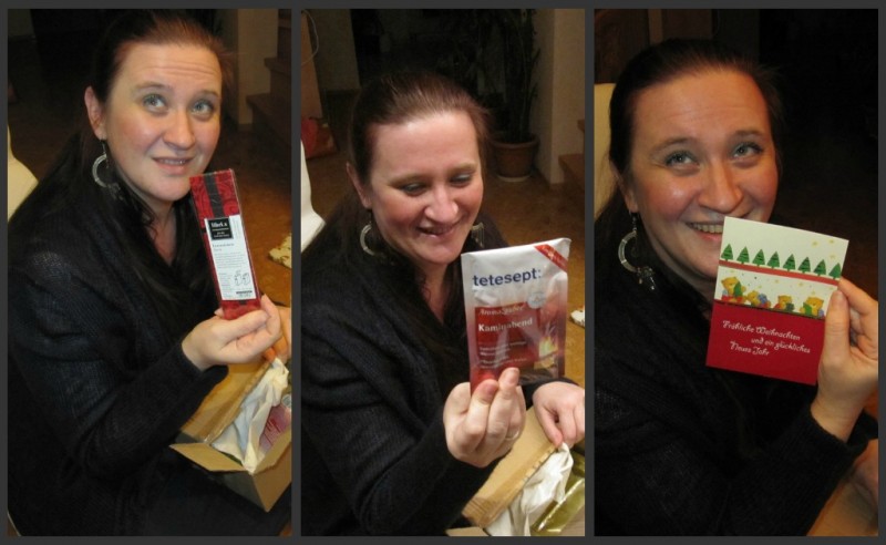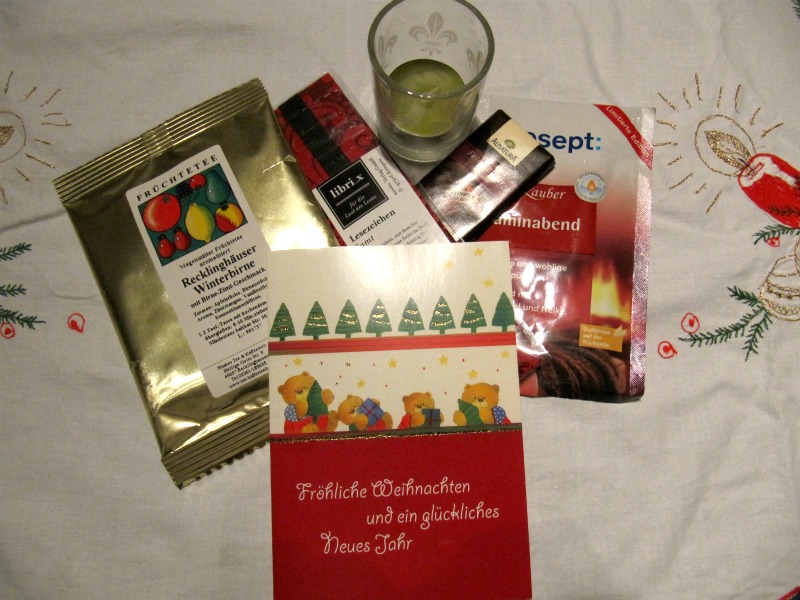 Die Alnatura-Schokolade stammt aus 64404 Bickenbach, das Tetesept-Bad aus 60048 Frankfurt, das Samt-Lesezeichen ist vom Moses-Verlag aus 47906 Kempen, die bĂ€rige Postkarte wurde in der Schweiz gedruckt und meine ganzen Hoffnungen habe ich auf den Tee mit den Namen „RecklinghĂ€user Winterbirne“ gesetzt, welcher auch tatsĂ€chlich aus einem Laden in 45657 Recklinghausen stammt. Nur gelingt es mir leider nicht heruaszufinden, welche Wichteline in diesem StĂ€dtchen zu Hause ist    :verrueckt:    aber ich habe noch nicht aufgegeben und schnĂŒffle weiter. Such- und sachdienliche Hinweise nehme ich supergern entgegen    😀