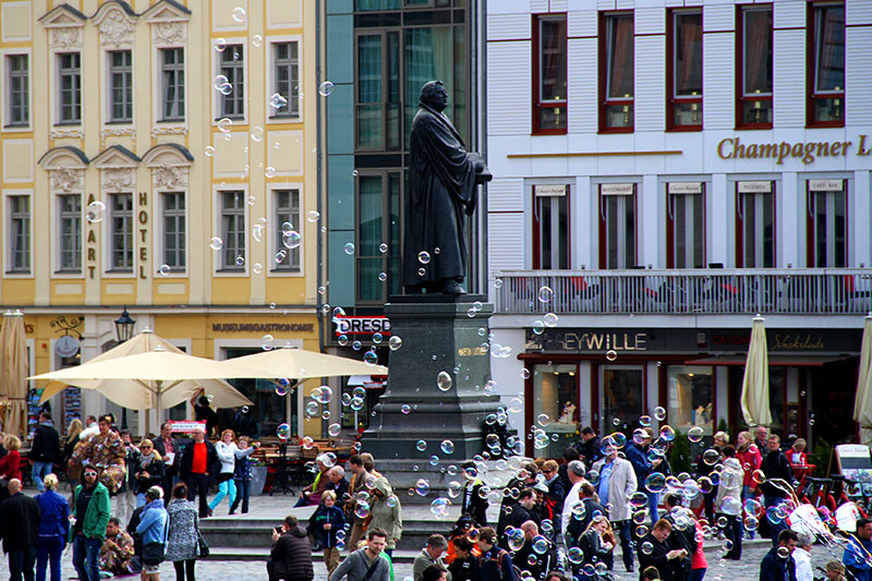 Am Neumarkt gab es wieder einen Seifenblasenregen. Wir haben das zum ersten Mal im Februar gesehen, als wir unserem Gast aus Australien die Stadt gezeigt haben. Seifenblasen faszinieren wirklich Alt und Jung und sogar Martin Luther scheint sie zu mögen: