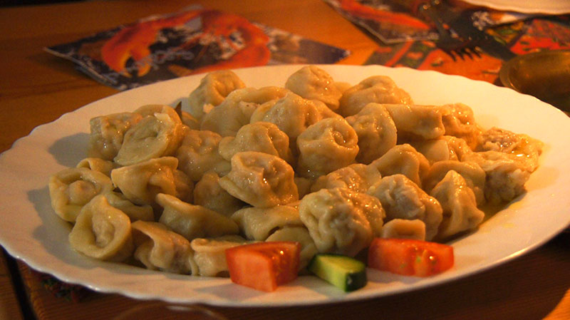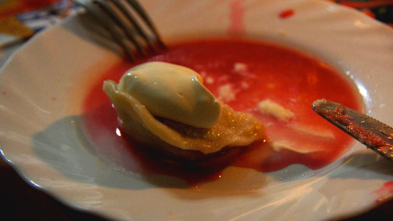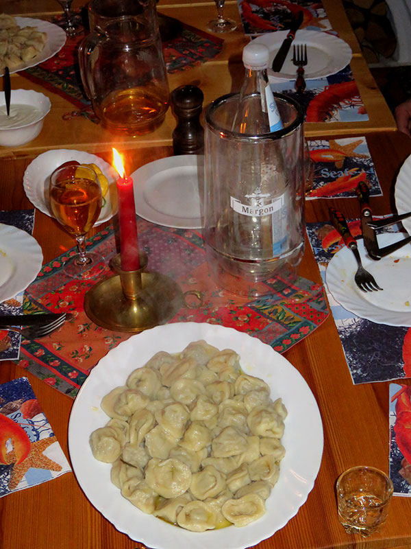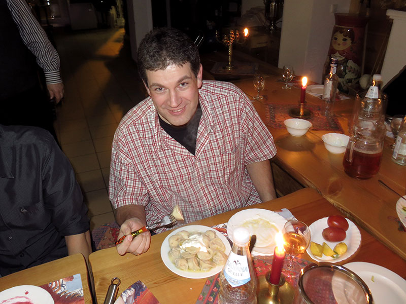 Die Kirschfüllung war sogar der Favorit der Frauen, während die Männer, insbesondere mein eigener natürlich, eher von der Fleischversion angetan waren. So bekam Carsten sogar noch einen weiteren Teller mit Fleischpelmeni, da er freiwillig auf die süßen Wareniki verzichtete: