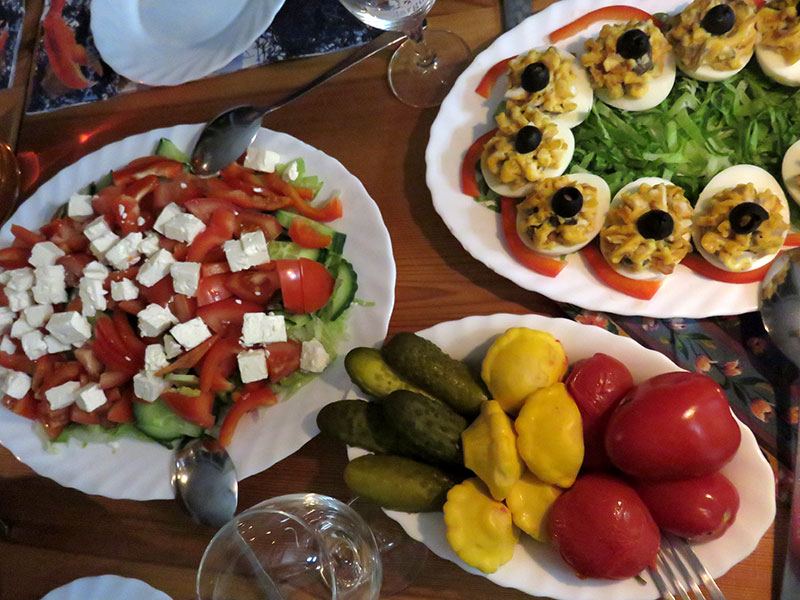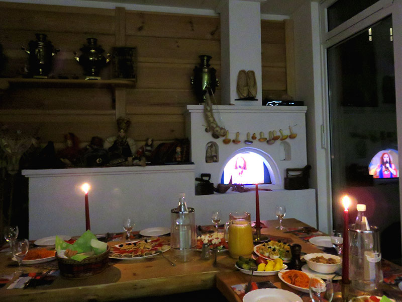 Am letzten Freitag war es dann endlich soweit. Als wir ankamen, war der Tisch am Ofen schon mit vielen leckeren Vorspeisen gedeckt, die Kerzen brannten und auch an russischer Musik mangelte es nicht: