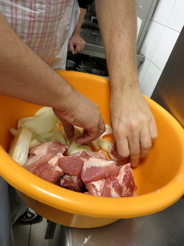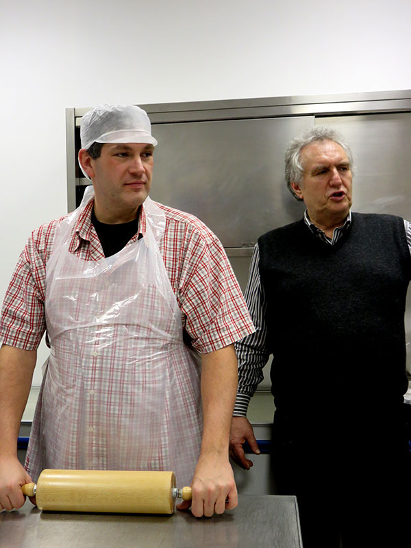Nach einer kleinen Stärkung inkl. der ersten Wodka-Runden wurden Häubchen und Schürzen ausgeteilt und wir durften uns in der Küche blicken lassen. Auf dem Foto überwacht Carsten in voller Montur und mit dem Nudelholz in der Hand zusammen mit dem Chef des Hauses, dass der Teig auch wirklich von allen ordentlich geknetet wird   😀   er muss diesen ja danach auch zum Teil selbst ausrollen   😉