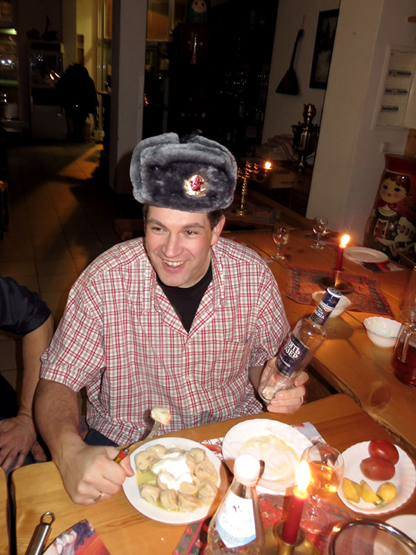 Wir haben beim Essen alle gestellten Quizfragen sehr gut beantworten können, wobei manche davon – wenigstens für mich – sogar recht leicht waren, bei einigen aber mussten wir wirklich demokratisch abstimmten, was die Mehrheit für richtig hält, da keiner von uns die korrekte Antwort wusste. Am Ende hatten wir dann doch genug Punkte gesammelt, um als Gruppe einen Gewinn einzuheimsen. Den Lohn haben Carsten und ich als „Gastgeber“ erhalten: er hat eine Packung Würfel mit kyrillischen Buchstaben bekommen, um noch besser Lesen zu lernen und ich bin jetzt bestens für einen richtig harten Winter gerüstet, denn mit dieser Mütze sind meine Ohren definitiv unfrostbar   😀