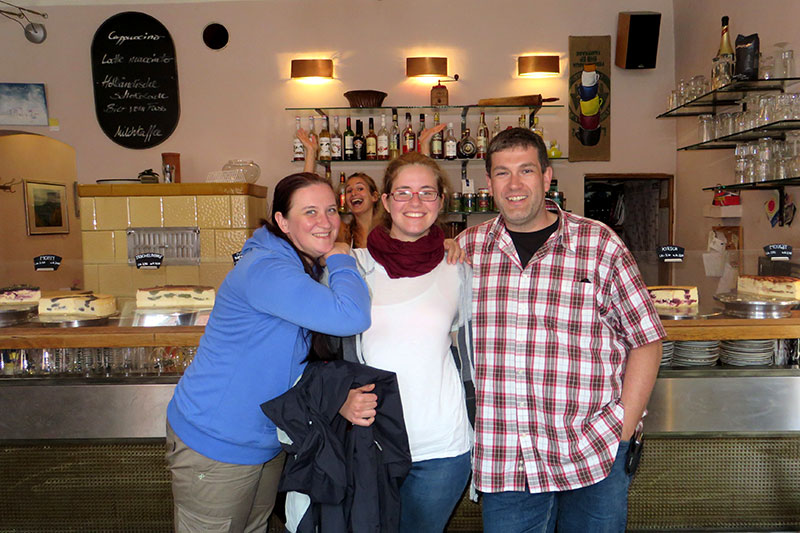 Auf dem Heimweg machten wir noch einen Zwischenstopp in Potsdam, um uns mit unserer Kleinen zu treffen. Als Treffpunkt haben wir uns das berĂŒhmte KĂ€sekuchencafe Guam im HollĂ€ndischen Viertel ausgesucht. Dort kennt sich Stephanie nĂ€mlich besonders gut aus, weil sie dort etwas Geld dazu verdienen darf    đ    Wir fanden ihren Arbeitsort ganz nett und die KĂ€sekuchen waren alle ausgesprochen lecker – zusammen haben wir 5 verschiedene Sorten probiert: Nougat, Stachelbeere, Kirsche, Florentiner Bienenstich und Eierlikör. Dazu konnten wir ihrem Chef die HĂ€nde schĂŒtteln, der sich uns persönlich vorstellte und ein paar nette Worte ĂŒber unser Kind sagte … das fand ich wirklich super! Und auch die Kolleginnen unserer Kleinen sind superlieb und gut gelaunt, wie man auf diesem Foto sehen kann   đ
