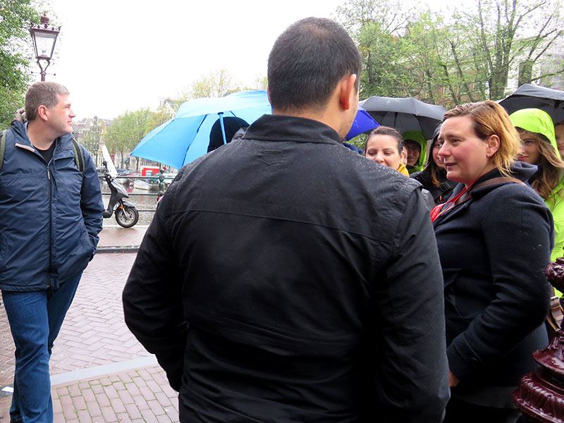 Das Wetter war genau so, wie man es von den Niederlanden im SpĂ€therbst erwarten hĂ€tte – es hat immer wieder ein wenig geregnet. Die FĂŒhrung von Kendra (gebĂŒrtig aus den USA) fĂŒhrte uns zu bekannten und weniger bekannten Orten, dazu haben wir einiges ĂŒber die MentalitĂ€t und das Leben der Amsterdamer und anderer NiederlĂ€nder aus ihrer Auswanderersicht erfahren. Auf diesem Foto ist sie auf der rechten Seite zu sehen: