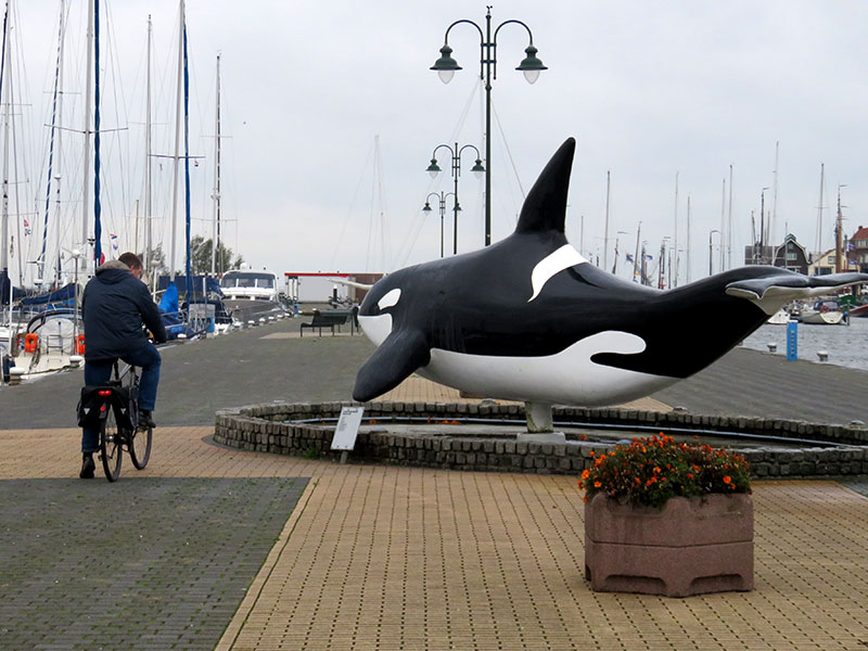 Im Fischerdorf Urk haben wir ganz schnell entdeckt, woher dieses Dorf seinen Namen hat. Schließlich hat man den Namensgeber Orca unĂŒbersehbar am Hafen als Wasserspiel bzw. Springbrunnen verewigt:
