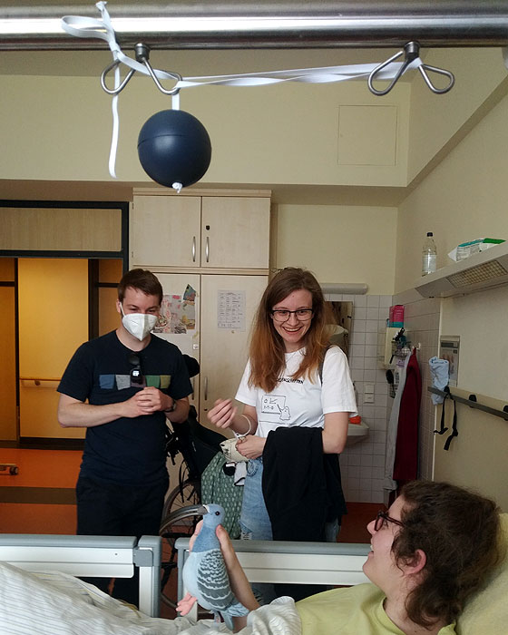 Dementsprechend war natürlich der August 2020 eine große Zäsur. Die Große hatte vor den Beschränkungen durch Corona noch ein paar Mal die Gelegenheit, Stephanie auf der Intensivstation der Charité zu besuchen, aber zu dem Zeitpunkt war ihre Schwester natürlich noch nicht ansprechbar – aufgrund des Wachkomas bzw. der Vollsedierung. Danach hat Andrea uns immer wieder mal etwas zugeschickt, was wir der Kleinen dann im Krankenhaus auf dem iPad abgespielt haben: Audiodateien („Gelaber“ wie sie es nannte, Vorlesen aus einem Buch) als Stephanie noch nicht ansprechbar war bzw. nicht reagieren konnte, weitere Audioaufnahmen, als sie so langsam aufwachte, und danach dann immer wieder mal Videos mit Erzählungen aus dem täglichen Leben, Erinnerungen aus alten Tagen, Fotostreifzügen nach Themen (z.B. schreckliche Outfits auf alten Fotos, Postkarten aus aller Welt), sowie Spiele zum Mitmachen und Trainingseinheiten (z.B. Tiergeräusche oder Lieder erkennen, gemeinsame Zungenbewegungen).
