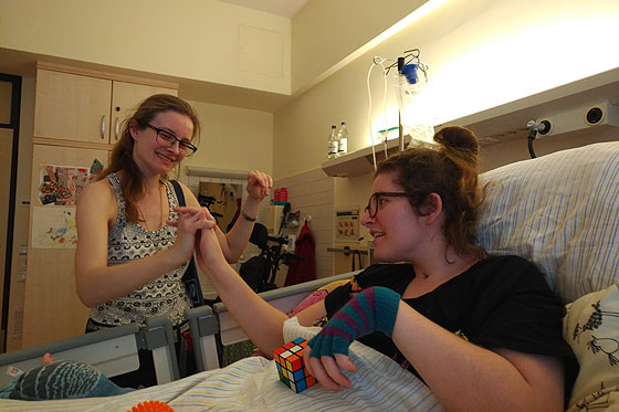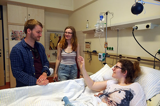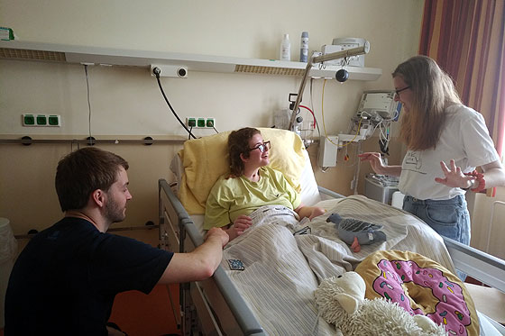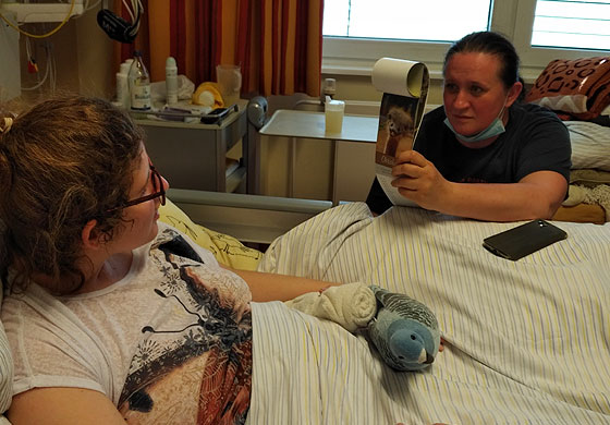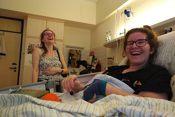 Natürlich hatte ich mit Stephanie schon seit ca. einer Woche den Besuch der großen Schwester vorbereitet und mit ihr viele Fotos und Videos geguckt sowie die Tage heruntergezählt. Dann kam endlich der große Tag … und Stephanie hat ihre Schwester im Zimmer nicht wiedererkannt bzw. auf Nachfrage wer das denn sei, leider den Namen einer von ihr heiß geliebten Pflegekraft genannt. Für uns eben auch wieder ein Beispiel dafür, dass dieses Köpfchen sehr viel abbekommen und das Gehirn sicherlich sehr viel verloren hat oder darin noch sehr viel aufgeräumt und neu verknüpft werden muss. Erst als der Name Andrea fiel, wurde ihr bewusst, dass ihre „Eumy“ endlich zu Besuch da ist. Von Montag bis Donnerstag war die große Schwester jedenfalls immer mit dabei und der Rest, also Karl und Carsten, teilte sich dynamisch mit rein, damit man nur zu zweit oder zu dritt im Zimmer war. Denn bei vier Leuten hat Stephanie schon den Überblick verloren und war mit der Situation insgesamt etwas überfordert – einfach viel zu viel Tumult um sie herum. Das zeigte sich z.B. ganz schnell am allerersten Tag, wo wir zuerst noch für das erste Aufeinandertreffen gemeinsam zu viert im Raum standen und sie völlig aufgedreht und trotzdem verwirrt wirkte. Erst als Carsten und Karl spazieren gegangen sind, konnte sie sich völlig auf Andrea konzentrieren und ihre Freude endlich in vollen Zügen genießen.