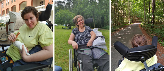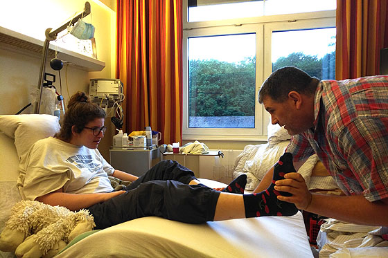 Dort kurven wir ein bisschen durch die Außenanlagen und den Wald und hocken uns am Ende immer irgendwo hin und quatschen, futtern oder spielen etwas. Einmal hat es draußen allerdings sehr stark geregnet und da sie aus dem Bett nicht viel davon sehen konnte, haben Carsten und ich sie an die Bettkante zum Fenster hingesetzt – sie war total happy! Sie findet ja gerade Regen so toll!