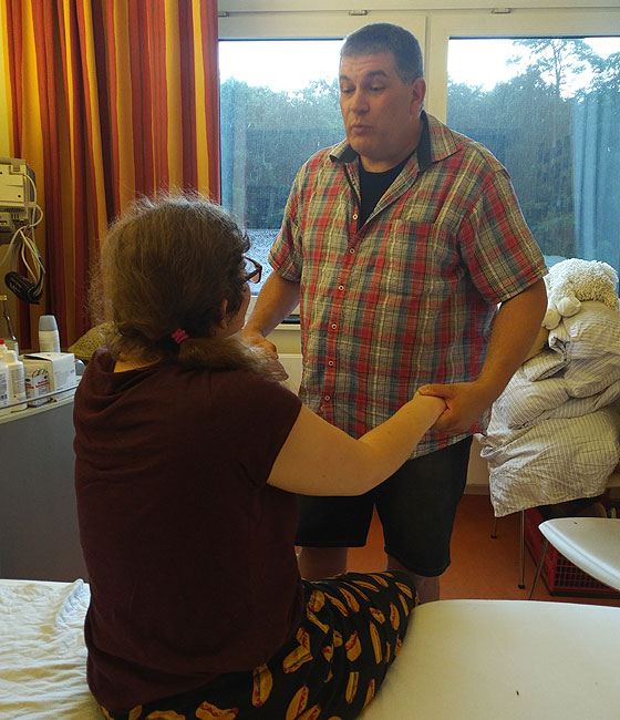 Zum Glück will sie ja insgesamt schon immer alles mitmachen und ausprobieren, d.h. sie blockt nicht ab oder schmollt, sondern findet an allem was wir machen großen Gefallen. Das ist schon mal sehr viel wert. So haben wir ihr auch noch einmal das Gesamtbild erläutert, denn jetzt kommt es immer mehr darauf an, dass sie Fortschritte macht. Die Krankenkasse hat nun bis zum 1.8. verlängert, aber man könnte so langsam immer mehr Zweifel bekommen, dass es noch länger so weiter geht. Der Singer-Index mit 13 scheint sich gerade leider nicht sonderlich ändern zu wollen, da hierbei aber auch nur auf ganz bestimmte Dinge fokussiert wird, die derzeit bei ihr noch Zukunftsmusik und somit weit entfernt sind. So z.B. selbstständiges Waschen und Körperpflege, An- und Auskleiden, Toilettennutzung oder aber die Fähigkeiten der Fortbewegung und des Gehens. Da müssen bald sehr viel deutlichere Erfolge her – andernfalls steht demnächst dann doch der Wechsel in eine Pflegeeinrichtung ins Haus, was am Ende aus medizinischer Sicht sicherlich nicht schlechter ist, aber für uns würde sich der Weg dorthin leider verdoppeln. Wir hangeln uns da gerade etwas von Monat zu Monat …