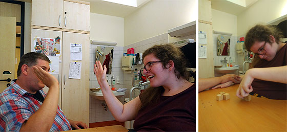 • große Sorgen bereiten uns ihre Unbeständigkeit bei den Farben (mal mehrere hintereinander richtig, an anderen Tagen scheint alles Grün oder Gelb zu sein) und ihre Erkennungsrate bei den Memory-Kärtchen (Wolke und Regenschirm derzeit top, dafür werden Apfel, Birne, Möhre und Hahn/Huhn weiterhin nicht erkannt)