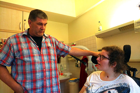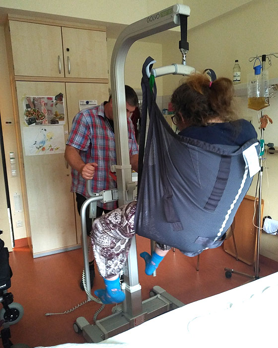 Doch glaubt mir, einfach ist es nicht, einen erwachsenen Menschen ohne jegliche Mithilfe seinerseits in die aufrechte Position zu bekommen und dann dort auch zu halten. Ich saß am Ende auf dem Bett in Stephanies Rücken und Carsten hockte neben ihr. Ich warte wirklich sehr sehnsüchtig auf den Tag, an dem sie dabei helfen kann, sich an der Bettkante aufrecht hinzusetzen oder auch mal in den Rollstuhl zu kommen. Hier ein Beispiel, wie so etwas mit dem Lifter, den sie mittlerweile viel mehr akzeptiert hat, aussieht: