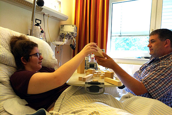 Beim Reden stellen wir auch immer wieder fest, dass sie manche Dinge trotz offensichtlich gestörtem Kurzzeit-gedächtnis hervorkramen kann, vieles aber innerhalb von Minuten vergisst. Noch finden wir nicht die kausalen Zusammenhänge, aber sie scheint was das angeht wirklich sehr selektiv zu sein. Was ihr wichtig ist, speichert sie sich sehr oft fest ab, alles andere wird gnadenlos über Bord geworfen – blöd nur, wenn man schon gerne wissen würden, was sie so gegessen hat oder in den Therapiestunden machen durfte. Ist ihr eben nicht sonderlich wichtig … aber Spaß machen ihr die Therapien, denn sie war gestern sehr enttäuscht, dass sie am nächsten Tag (SO) keine haben würde.