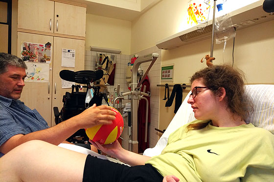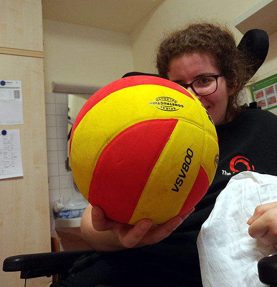 Hier muss sie beim Weiterreichen von der einen Seite des Bettes zur Person auf der anderen Seite schließlich beide Hände zur Hilfe nehmen … auch wenn Carsten ihr mittlerweile recht erfolgreich das Halten des Volleyballs mit nur der rechten Hand beigebracht hat (üben mit Gleichgewicht und Kräfteeinteilung in den einzelnen Fingern) …