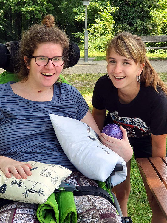 Man sieht, die Besuchszeiten spielten sich aufgrund des herrlichen Sommerwetters auch diesmal hauptsächlich draußen ab … sei es zum Schaukeln, zum Entdecken und BeGREIFEN, zum Lachen oder auch zum Üben und Trainieren. Saß Stephanie einmal im Rollstuhl, waren wir zum Beispiel in der Regel auch immer sehr schnell im Park und meist auf unserer Lieblingsbank: