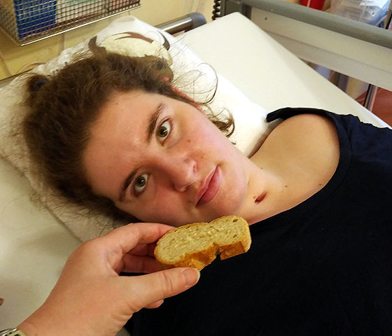 Im ersten Video vom 13. April lag sie noch recht unbeweglich im Bett, konnte nicht sprechen und weigerte sich auch, den Mund aufzumachen. Ich wedelte verführerisch mit einer Pommes im Gesicht, an der sie zwar immer sehr gerne gerochen hat, aber die Lippen blieben trotzdem versiegelt. Heute lacht sie darüber …