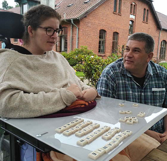Nachmittags ging es dann in Runde 2 im Pflegezentrum und wir haben gemeinsam sehr viel Spaß gehabt und viel gelacht. So z.B. als beide mit tiefstem Sächsisch anfingen und u.a. den Ausspruch „Or’sch wer bleede !“ original zum Besten gaben. Bei der abschließenden Runde Mensch-ärgere-dich-nicht hat Stephanie sogar (fast ehrlich) gewonnen – bei ihr haben wir gelegentlich mal eine Ausnahme bzgl. Rauswurfzwang gemacht. Aber sie stellte alleine das gesamte Spielbrett auf, zog eigenständig ihre Spielfigur wie Carsten es ihr zeigte (sie hat noch große Probleme mit der Richtung und in den Ecken bzw. im Stall), zählte fast immer korrekt die gewürfelten Felder ab und würfelt mittlerweile ja sowieso schon komplett selbstständig.