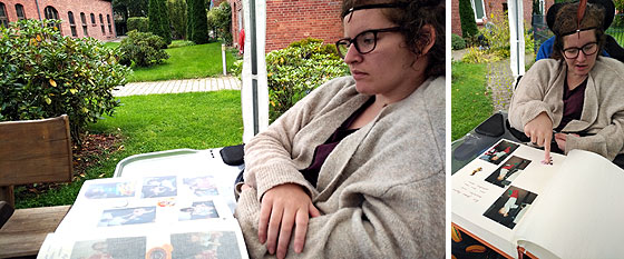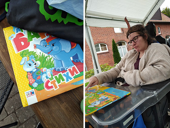 Wir sind auch noch immer mit Eifer dabei, mit ihr das Überziehen der Ärmel zu üben (leider sind noch zu viele Anweisungen und Hilfen notwendig), sowie das Umblättern von Seiten (bei dickeren Seiten, z.B. einem Fotoalbum, erkennt sie sofort, wenn sie mehrere erwischt und korrigiert nach) …