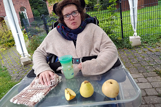 Wenn wir schon mal beim Essen angelangt sind, kann ich mit diesem Oberbegriff ja erst einmal weitermachen. Da es insgesamt doch nur zwei reguläre Besuchstage waren, bekam sie eben auch nur zwei Mal den Geschmack-des-Tages: am Dienstag waren das Apfel und Birne (sie hat sogar die Begriffe richtig zugeordnet) …