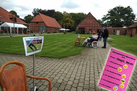 Thema 1: Beim Warten auf den MDK haben wir von unserem Pavillon aus u.a. dem Treiben auf dem Gelände der Pflegeeinrichtung zugeschaut, wo fleißig für eine kleine Olympiade nach dem Mittag aufgebaut wurde. Zuerst hat Stephanie zwar bezweifelt, dass sie an den Stationen mit teilnehmen kann, doch am nächsten Tag zeigte ihr Stationsschein (unten rechts), dass es doch nicht so war, denn sie hatte ja schließlich für alle sechs Aufgaben einen Aufkleber bekommen: