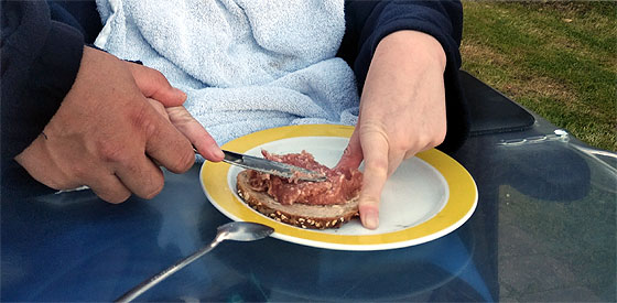Doch trotz aller Gelüste und vermisster Geschmäcker, selbst einen Bissen von ihrem heißgeliebten Mettbrot gibt sie weiterhin gerne ab … herrlich, Stephanie füttert Carsten!!!