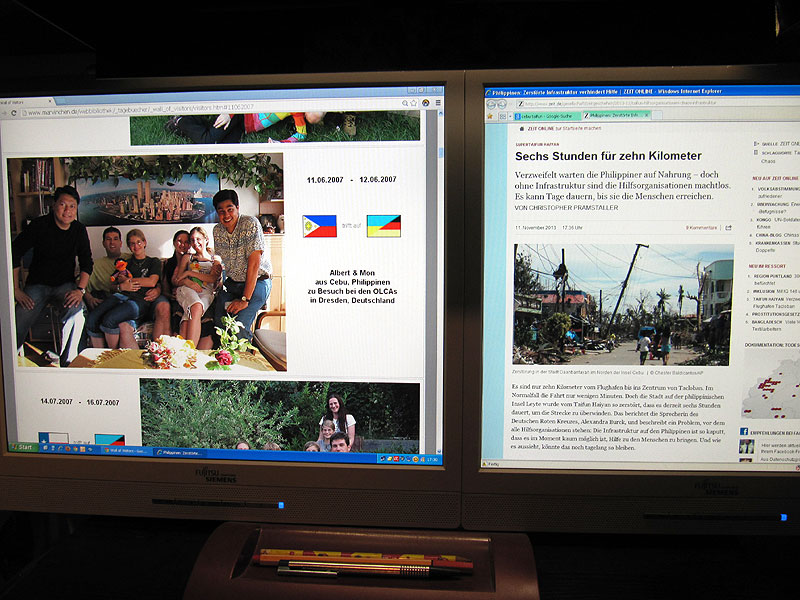 von Carsten: ein Taifun über den Phillipienen ist ungefähr so wie ein Waldbrand in Australien oder ein Tornado in Deutschland ... hört sich groß an, aber ohne genaue Ortsangabe könnte es überall sein. Erst heute habe ich mitbekommen, daß Haiyan massiv Cebu getroffen hat - unsere Gedanken sind bei unseren CouchSurfing-Freunden aus Cebu, ihren Familien und natürlich bei allen Betroffenen. Auch um 17:30 Uhr ...