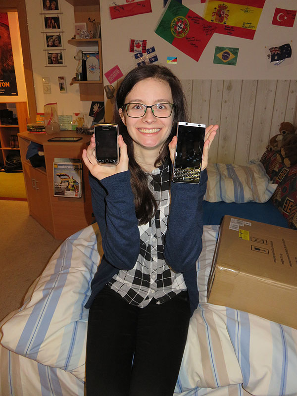 von Carsten: die Große ist ins Apartamento OLCA gekommen und tauscht ihr altes Blackberry Torch gegendas von mir neu eingerichtete Blackberry KeyOne ... eines ihrer Weihnachtsgeschenke