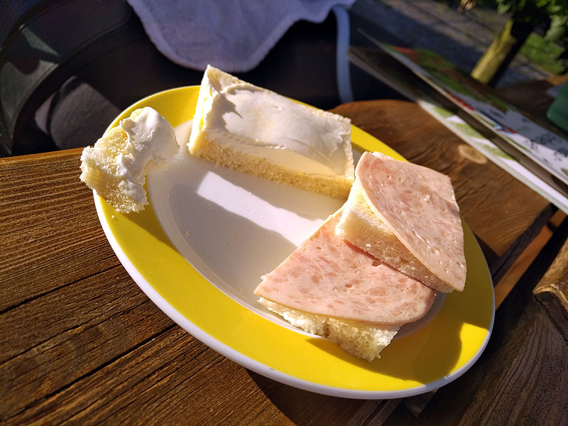 wieder Wurstscheiben und ein nicht-angedicktes Getränk zu sich nehmen