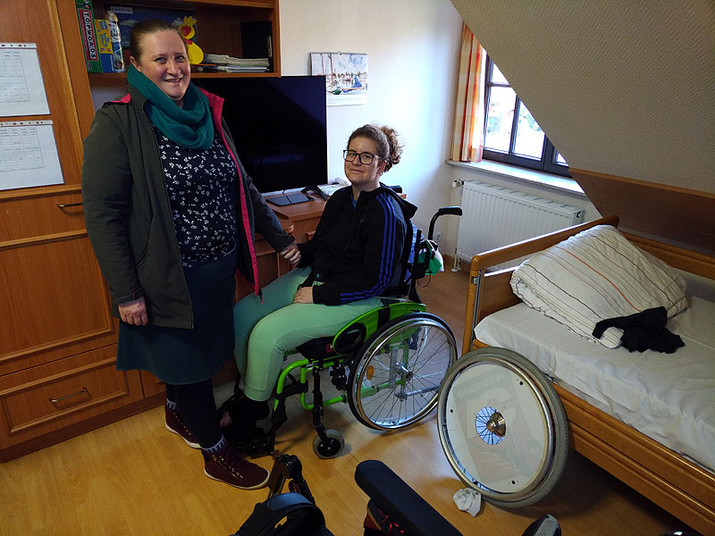 von Carsten: Abholung von Stephanie im Pflegezentrum, wobei ihr alter Rolli noch repariert wird (Reifen rechts) und siegerade in einem Testrolli sitzt, der aber dem entspricht, welcher (hoffentlich) im April geliefert werden soll.