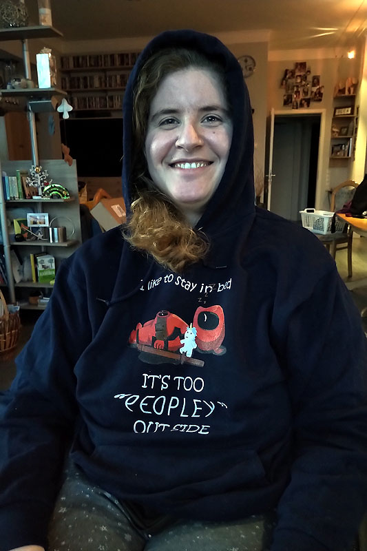 von Olga: während Carsten noch im Büro ist, sortiere ich mit Stephanie ein paar ihrer alten T-Shirts und Pullover aus