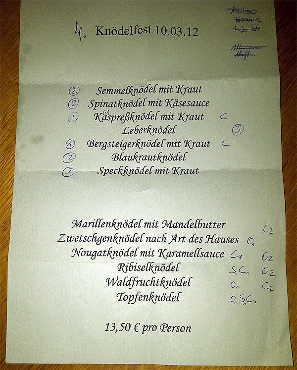 10.03.2012 | Durch Dresden-For-Friends sind die OLCAs auf das 4. Dresdner Knödelfest in der "Almhütte" aufmerksam geworden und eine solche Gelegenheit wollen sich Olga, Carsten und Stephanie nicht entgehen lassen. Zum einen locken natürlich leckere Knödelkreationen, wie z.B. Kaspreß-, Bergsteiger-, Speck-, Semmel-, Spinat-, Blaukraut-, Marillen-, Nougat-, Ribisel- und Topfenknödel, zum anderen bleibt aber auch zwischen 17 Uhr und 21 Uhr genug Zeit, um in entspannter Atmosphäre über Gott und die Welt, die Schule und das Leben und über die Zukunft zu reden. >>_Beweisfoto_<< |