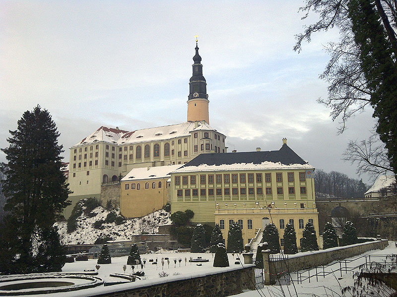 15.12.2012 | Begleitend zum kinderfreien Frühstück läuft die DVD "Der Mandant" (der Film mit Matthew McConaughey, Ryan Phillippe und Marisa Tomei in den Hauptrollen ist überraschend gut) und nach dem üblichen Wochenendgewusel in der Casa OLCA fahren Olga und Carsten am Nachmittag mit den Stötzners zum Schloß Weesenstein. Anna hatte Olga zum Geburtstag vier Karten für das Programm "Die Weihnachtswünsche des kleinen Nimmersatt" mit Josephine Hoppe als Vorleserin heiterer und besinnlicher Geschichten zur Weihnachtszeit und Dirk Ebersbach am Klavier geschenkt. Daß die Veranstaltung eine Art Kinder- & Familienprogramm ist, stört am Ende aber wirklich niemanden, denn so fühlen sich die Stötzners eben als Großeltern und die OLCAs als Eltern - nur die lieben Kinderlein fehlen. Neben der gelungenen Veranstaltung und dem halbstündigen Feueralarm aus dem Nachbarraum, wird aber immer ein wunderbares Bild im Gedächtnis bleiben: das märchenhaft verschneite Schloß Weesenstein. |