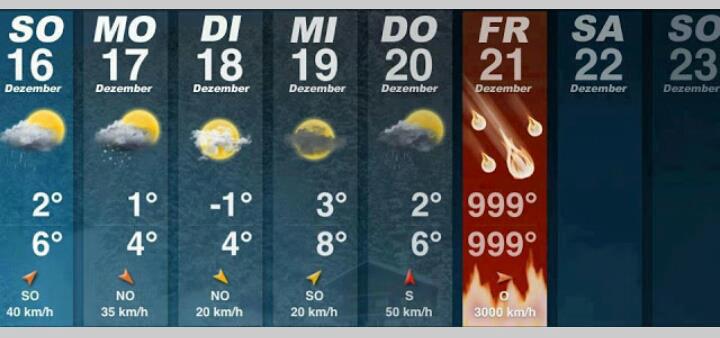 16.12.2012 | Eine gute Eigenschaft hat der ganze Weltuntergangs-Wahnsinn in 2012 ja, denn die angebliche Maya-Prophezeiung ist glücklicherweise nur befristet und wird uns nicht auch noch das ganze Jahr 2013 verfolgen. Auf Facebook kursieren ab heute schon die Wetteraussichten für den 21.12. :o) |